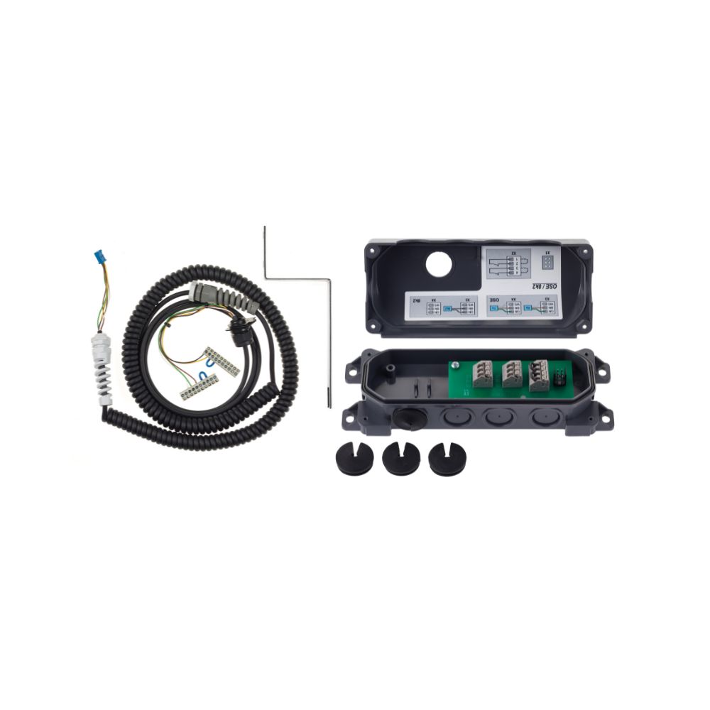Spirálkábel 5 × 0.25 mm, 1.6 m hosszú vezérlőkábellel, kivetőkonzollal, 70 × 70 × 47 mm méretű műanyag dobozzal