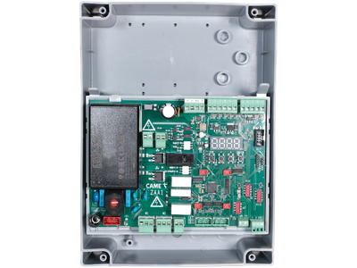 ZLX230P kétmotoros multifunkciós vezérlés, házzal, digitális kijelzővel, erőbeállítással, zárási és nyitási lassítással, működési idő szabályozással, 230V-os motorokhoz, részleges nyitással, kettő biztonsági bemenettel, beépített kétcsatornás rádióvevővel. AF frekveciakártya, RSE kártya, RIO kártya, CXN BUS kártya és CAME Key csatlakozási lehetőséggel, transzformátorral. Maximum 250 felhasználó adatainak tárolására.