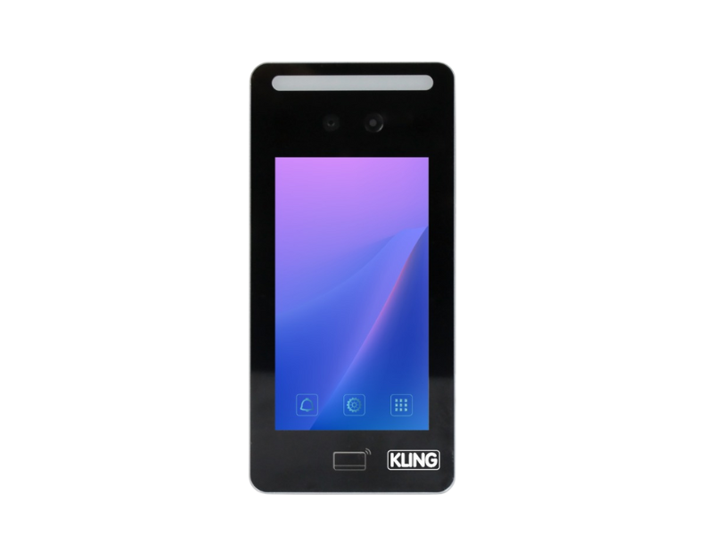 KLING arcfelismerő, proxy kártya olvasó és kódzár beléptető szenzor, 5 hüvelykes LCD érintő képernyővel, 12V DC tápról működik, beltéri, NO vagy NC kimenettel, lekérdezhető belépésekkel, beállítható jogosultságokkal, 2000 arc, 2000 beléptető számkód és 2000 proxy kártya tárolására.