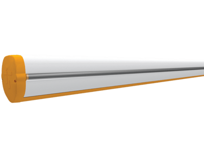 Alumínium sorompó árbóc 130 x 85 mm keresztmetszetű, 6400 mm hosszú, oldalsó LED csík fogadására előkészítve, takaróprofillal, alsó sárga ütközőgumival, kupak nélkül.